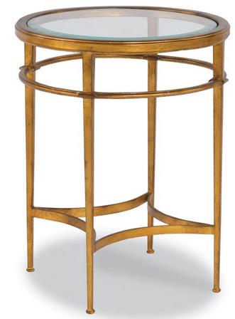 Description: Medeleine Round Side Table, #50 Gold Leaf with Antique Patina Finish, Glass Top