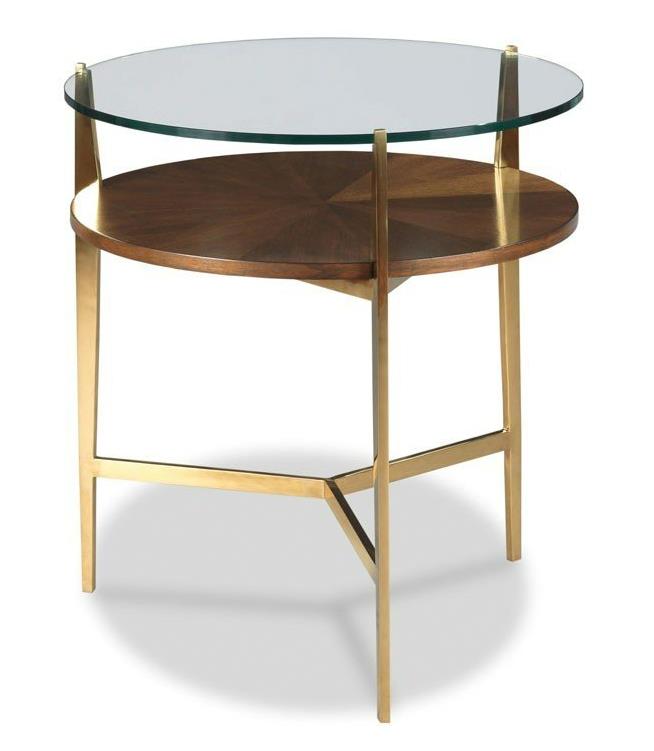 Description: La Scala Drink Table, 21 Lisse Finish, quarter sawn walnut veneer in sunburst pattern with Polished Brass base, tempered glass shelf